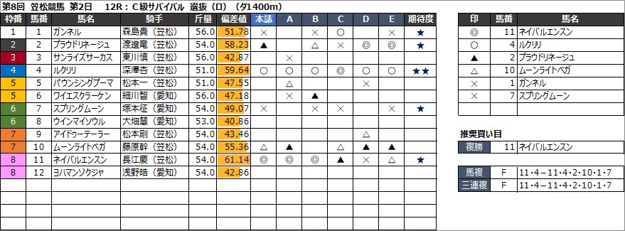 2023年8月31日(木) 笠松競馬の全レース予想です。