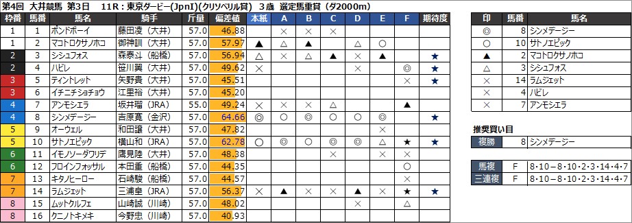 大井競馬予想 6月5日(水) 東京ダービー(JpnI) 他
