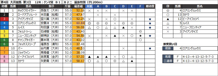 12R:ゲンマ賞 B1三B2二 選抜特別(ダ1200m)