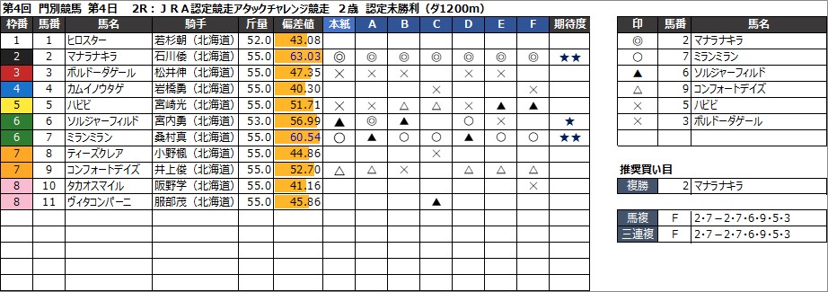 2R:JRA認定競走アタックチャレンジ競走 2歳 認定未勝利(ダ1200m)