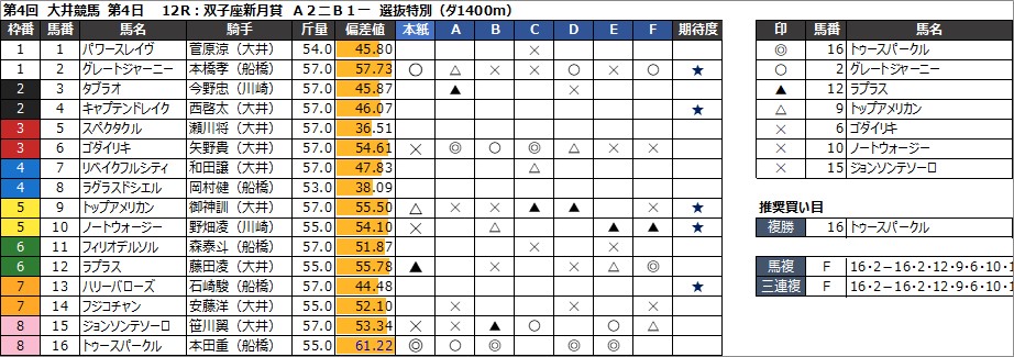 12R:双子座新月賞 A2二B1一 選抜特別(ダ1400m)
