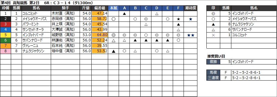 高知競馬予想 6月9日(日) セグロセキレイ特別 他