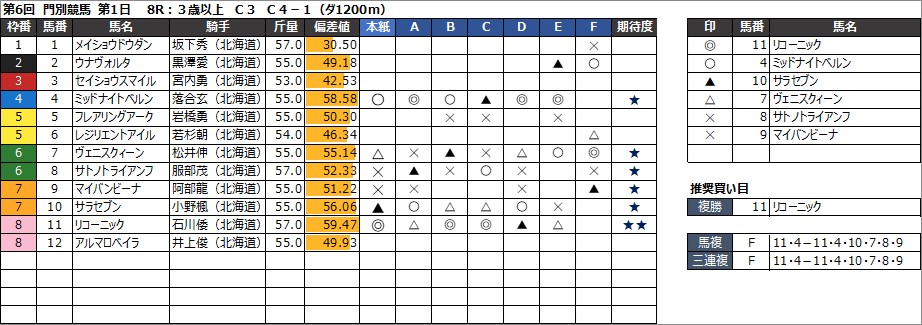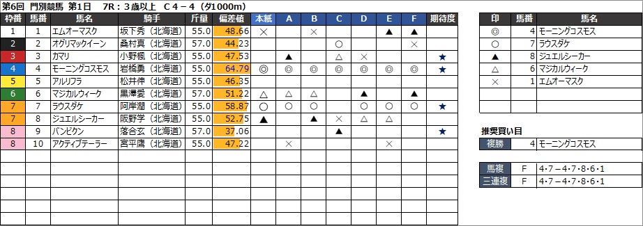 門別競馬予想 6月25日(火) ネジバナ特別 他
